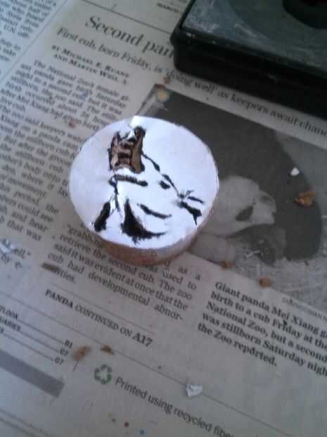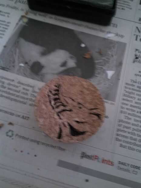 2. Vierta un poco de su tinta y utilice su cuchillo como una pluma - es decir, sumergir en la tinta y luego volver sobre las líneas que ya hayan cortado el corcho. El papel absorbe algunos de lo exceso de tinta y por lo tanto ayuda a evitar borrar el corcho, pero para esquivar más este problema, utilice sólo una pequeña cantidad de tinta a la vez que traza las líneas. Para las formas, sin embargo, puede que desee cargar el cuchillo absolutamente pesadamente con tinta.