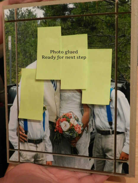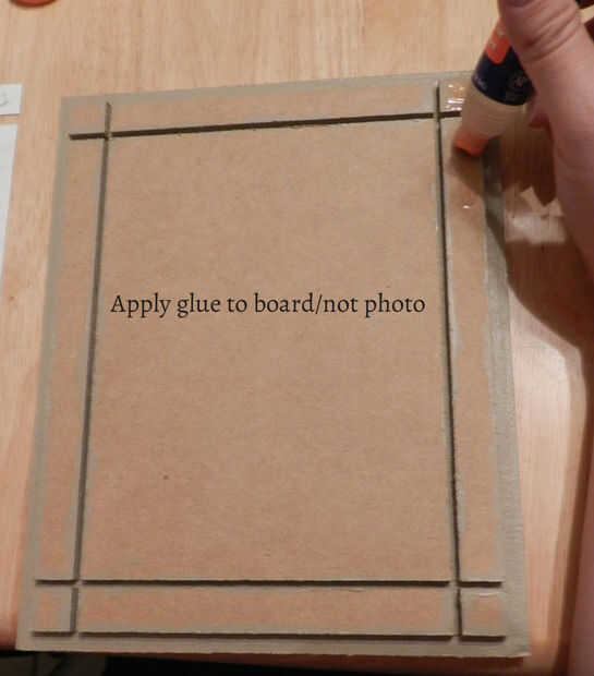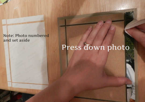 2. pegar pedazos de foto a Junta. De que las esquinas y los bordes estén asegurados. Recomiendo usar una servilleta para pulsa la foto en su lugar, esto evitará huellas digitales entren en la foto. Si utiliza un pañuelo de papel, se dejan pelusa en su foto en la que se amplifica cuando la resina se agrega!