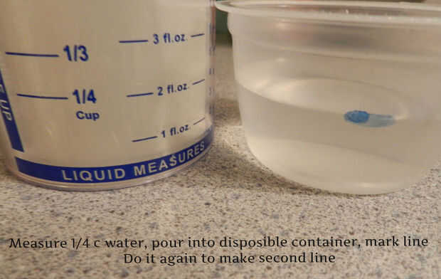 3. Llene la taza de medición una vez más y añadir otro 1/4 c a los contenedores desechables y marque la altura del agua.