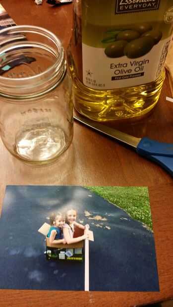 Materiales - arpillera, tarros de mason, fotos, pistola de pegamento caliente, tijeras y aceite de oliva
