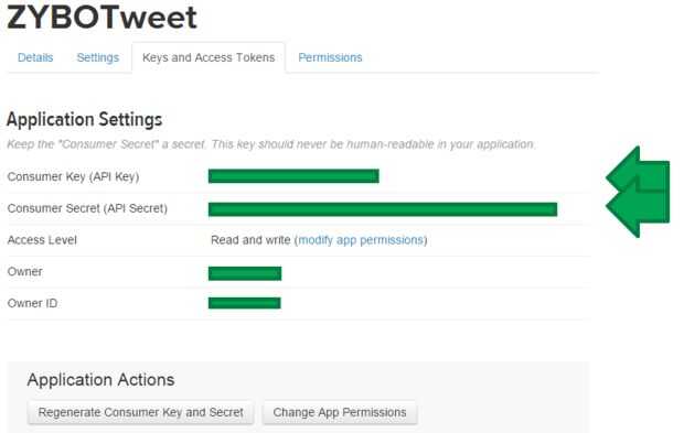 Verás la Configuración de la aplicación, habrá una clave de consumidor (API Key) y un consumidor secreto (secreto de API). Desplácese hacia abajo y generar sus Tokens de acceso, éstos tendrán un Token de acceso y un secreto de Token de acceso.