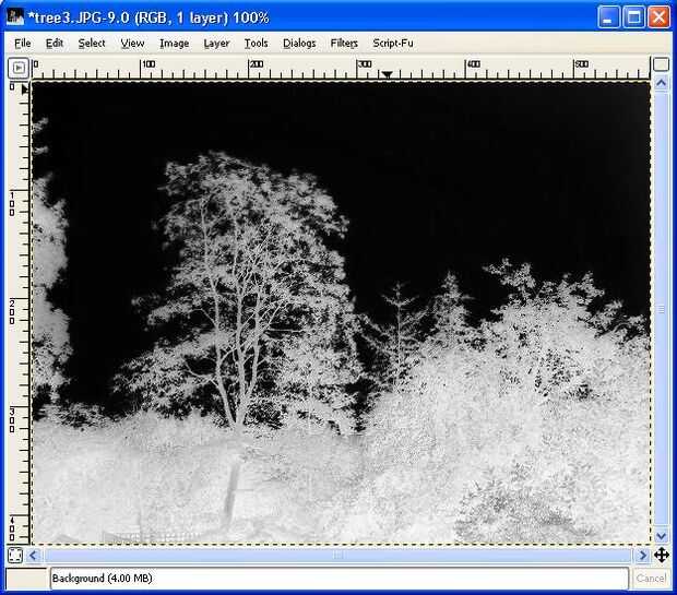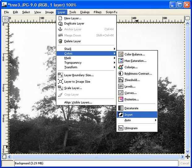 Ahora, la imagen desaturada no está lista para ser usado como una máscara de capa. Recuerde que las partes blancas que la imagen opaca y negra lo hace transparente. Si usted utiliza esto como una máscara de capa, utilizaría las partes brillantes de la imagen brillante y las partes oscuras de la imagen oscura-exactamente lo contrario de lo que queremos. Para rectificar esto, invertir la imagen en escala de grises (capa -> colores -> invertir). Si la imagen necesita brillo, hacer la operación de las curvas como mina de antes no, así que me salté este paso.