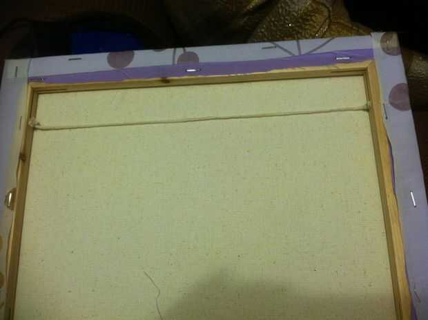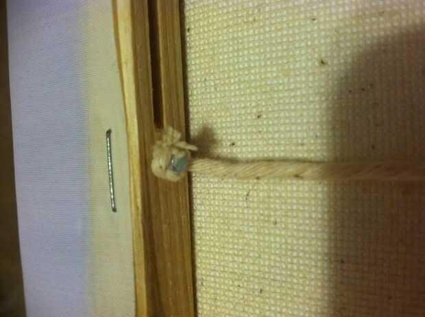 Encontrar algunos clavos que puede clavar horizontalmente en el lado de la madera que soporte el lienzo sin ella atizando a los lados, preferiblemente un clavo con una cabeza de tamaño decente. Un nudo doble en el extremo de la cuerda mientras está todavía en el carrete. Empuje el extremo de la uña a través del nudo, para que la uña va por en medio del nudo y la cabeza es al final. Esto de uñas en un lado de la imagen, estirar la cuerda para que usted sepa cuánto tiempo tiene que llegar al otro lado, deja una pulgada extra y cortar la cadena. Otro nudo y repita para el lado de oposición.