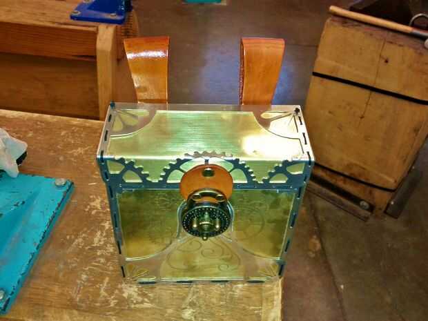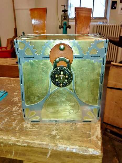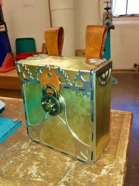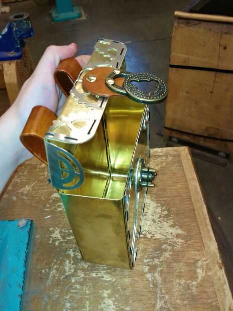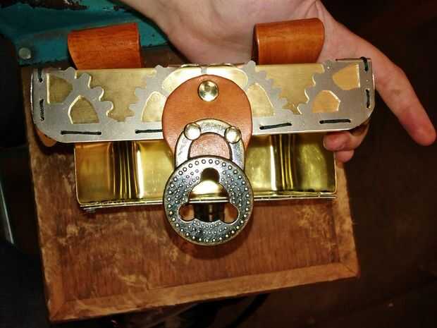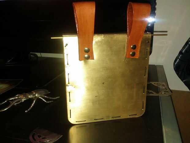 Aquí está mi primer intento en una bolsa de steampunk, de latón, níquel y cuero. El corchete de fijación es lo único que hice, lo compré en cuero de Tandy, una tienda de artículos de cuero.
