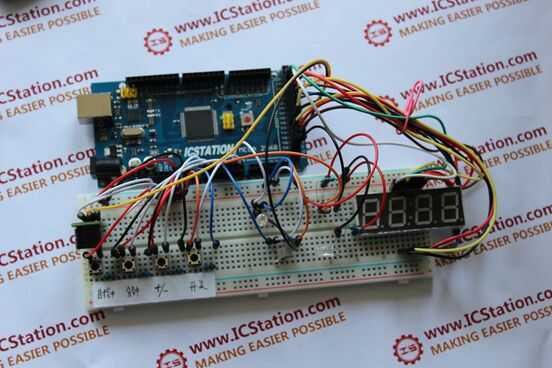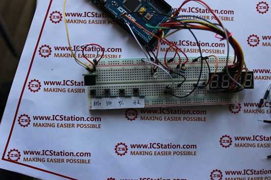 2 Conecte el pin 1 de todos los cuatro interruptores a la + 5V y el pin 3 a la conexión de GND. pin 2 del interruptor hora para el A4 y conectarse pin2 del interruptor minuto A1; conectarse el pin2 de +-conmutador A0; Conecte el pin2 del interruptor on/off a A6