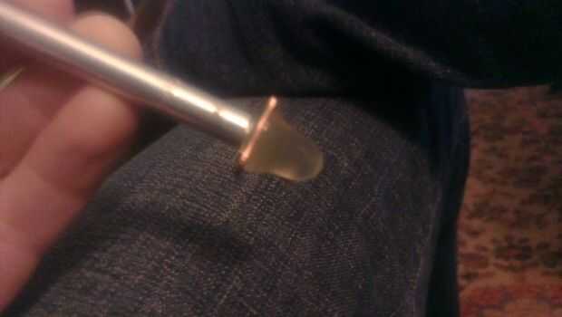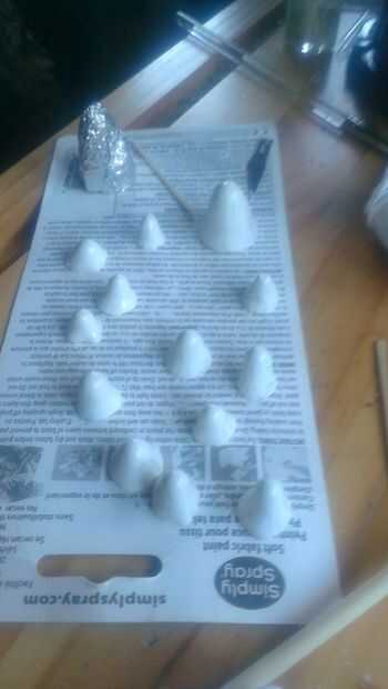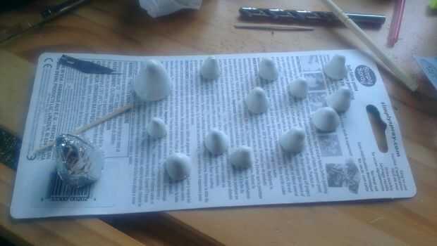 Para los dientes que necesitaba algo ligero y fácil atar. Tomé un mango de cuchillo x-acto y caliente había pegada una moneda de diez centavos hasta el final. Luego poner un pegote grande de pegamento caliente en la moneda de diez centavos y sin tocarlo, girar lentamente y que gravedad forman un poco pegote puntiagudo. Dientes perfectos!
