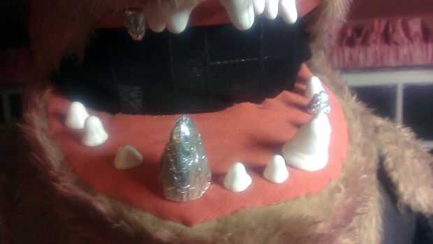 Una vez que hice un montón de ellos les pinté todo blanco. Esta obra grande y la variación en tamaños me dio la oportunidad de organizar por tamaño en la boca. El personaje en el videojuego tiene tenía algunos de sus dientes sustituidos con el metal, tan cubierto varios en papel de aluminio para la mirada del metal. Otro pegote de caliente pegamento en la parte inferior de cada diente y derecho pegado al interior de la boca.
