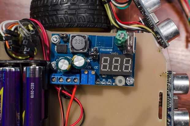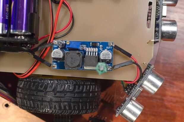 Accionado por un LM2596 TI 150 kHz 40V 3A convertidor DC-DC Buck, este módulo provee el riel de voltaje 5V necesarios para Nexys4 Junta, módulos de ultrasonido, lógica de conductor del motor y transmisor de RF, convertir desde el riel de 12V. Incorpora una pantalla de 7 segmentos, en la que muestra el voltaje de entrada o salido, o la corriente de salida (seleccionable mediante el botón de modo), que permite al usuario usar también en modo de corriente constante (además de la habitual tensión constante).