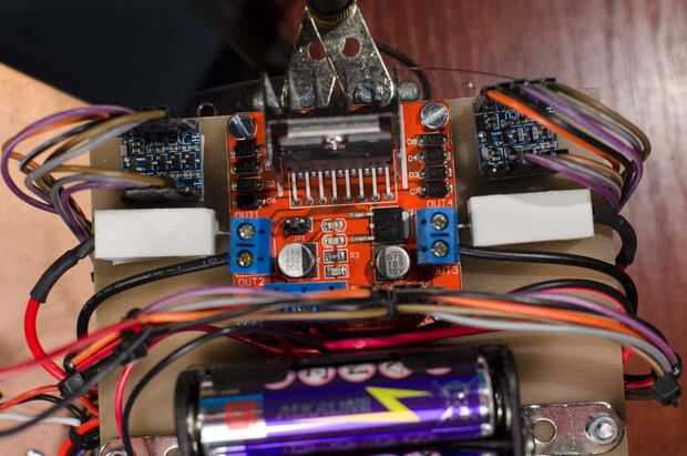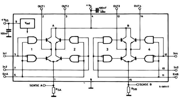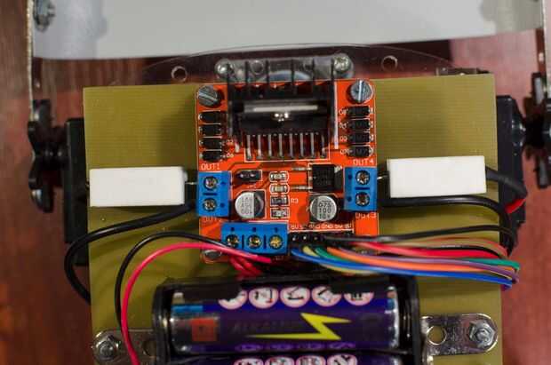 Este controlador de motor dual bidireccional se basa en el L298 doble puente H Motor controlador de circuito integrado. El circuito permite el control del estado y la dirección de dos motores de 5V a 35V, hasta 2A cada (25W total máximo). Lógica es suministrada a un nivel de 5V e incluye un Enable, y dos señales de polaridad de la impulsión del motor de control (como se muestra en su esquema interno). 10 ohmios, resistencia de 5W potencia limita la corriente por el conductor sobre 1A, reduciendo el riesgo de agotamiento prematuro de la batería.