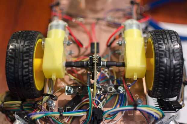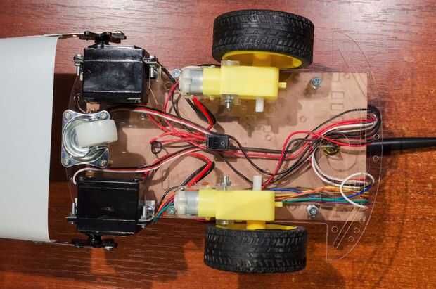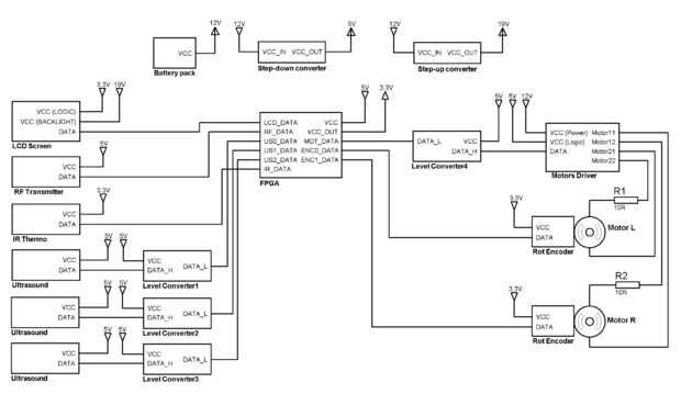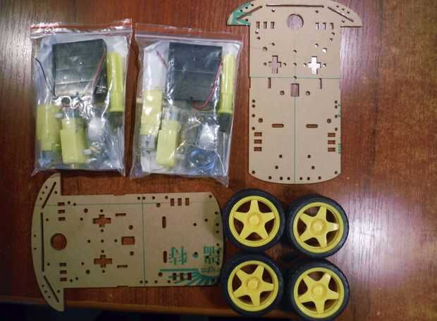 Ambas plataformas fue adquirido como un kit e incluye el tablero de soporte plástico principal, dos ruedas impulsado por motores de DC (con bridas de fijación), una tercera rueda pasiva y un botón de encendido (también tenía un soporte de pilas cuatro pilas tamaño AA, pero no fue utilizado). La estructura de múltiples capas se obtuvo utilizando tablas de cooper PCB ordinario (debido a su disponibilidad, precio y uso adicional como un plano de tierra).