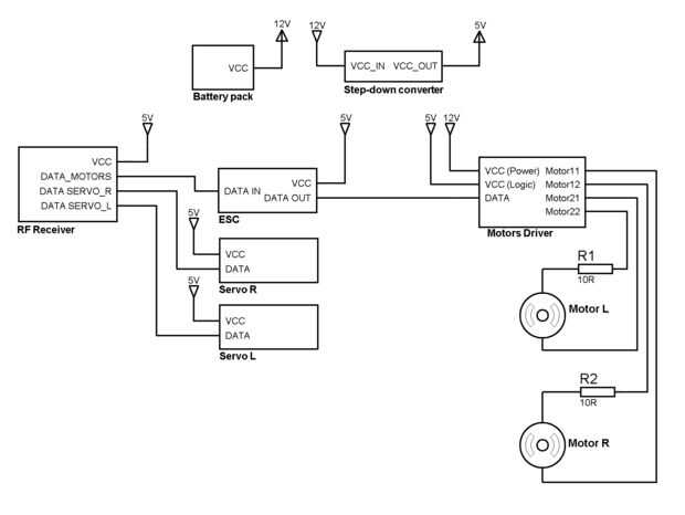 Este es un estándar, hobby-nivel, funciona con microcontrolador, ESC (control electrónico de velocidad) que convierten dos señales PWM de 50Hz (correspondiente al acelerador y dirección) en las seis señales necesarias para el conductor del motor. Que nos permite el simple puente H L298 para el receptor de RF de interfaz.
