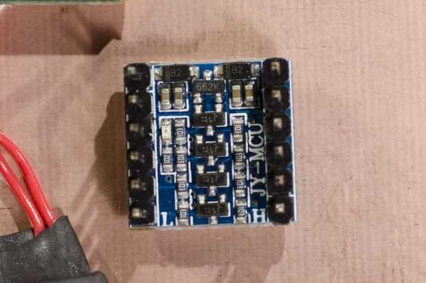 La parte del transmisor se recorte de la Junta de mando y remonta sólo a tres pernos (3V3 VCC, GND y datos). Protocolo del pin de datos ha sido decodificado y parece aceptar la siguiente secuencia serial: cada 20ms, un tren de pulso con pulso alto nivel cuatro (donde cada pulso corresponde a cada canal en el receptor, con su duración igual a la adición de 400 a la duración de pulso de la fuente), cada uno separado
