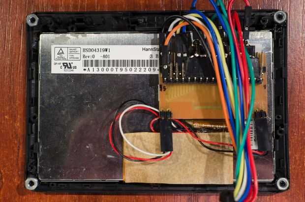 La HSD043I9W1-A de pantalla HannStar es una exhibición de color matriz activa thin film transistor (TFT) cristal líquido (LCD). Este módulo se compone de un panel TFT LCD, un circuito de conducción y un sistema de luz trasera. Este LCD de TFT tiene un área de pantalla activa de pulgadas medido diagonalmente 4.3 (16:9) con resolución WQVGA (480 por 272 píxel vertical horizontal). Datos RGB es introducidos a través del paralelo 24 bits (8 bits por color) y las señales sync (control) pueden ser ya sea a través de la sincronización Horizontal/Vertical Sync (según lo utilizado en el interfaz del VGA) o el uso de DataEnable/DataClock (donde DataEnable es alta cuando los contadores de la exhibición horizontal y vertical en la zona activa, con el DataClock a 10MHz). Fue rescatado de un navegador GPS defectuoso (como notado por su estructura de plástico marca), y porque tenía un cable de la flexión plana de bastante inaccesible 30 pines 0.5mm pitch, una placa de adaptador tuvo que ser construido para permitir el uso de un encabezado de echada de 2.54 milímetros más cómodo como un medio de conexión a la tarjeta FPGA.
