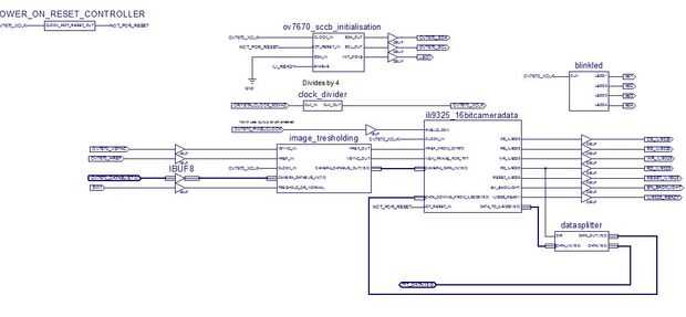Por último pero no menos importante. Es donde ocurre la magia real. El bloque obtiene imágenes desde la cámara OV7670 (impulsada por HREF y VSYNC líneas la cámara juntos indican un inicio + extremo del bastidor (imagen)). Dentro del bloque de la comparación para cada pixel se realiza (en tiempo real!) con las características de la gama de píxeles que buscamos (en este caso brillantes píxeles). SW1 es elegir qué ver en el TFT: imágenes de una cámara normal o las imágenes de tresholded. El bloque de image_treshold también envía las líneas VSYNC y HREF de la cámara al bloque ili9325 que es necesaria para manejar y sincronizar el TFT para mostrar las imágenes.