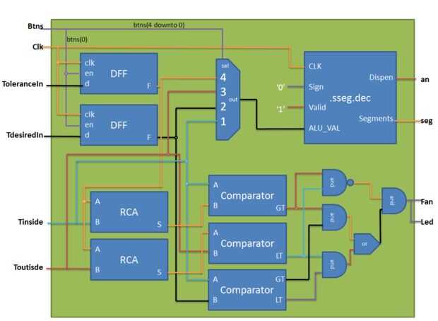 La mayoría de la lógica de este proyecto se realiza en un tablero de Basys3, y la caja negra del ventilador inteligente tiene 6 entradas y 4 salidas. Se utilizan todos los 5 botones en el tablero, 4 de los botones de control de lo que la exhibición de siete segmento debe mostrar, mientras que el botón derecho remite la temperatura deseada y la tolerancia a la lógica de la Junta. El ventilador inteligente utiliza un valor de tolerancia, representado en binario por los 4 interruptores de la derecha en el tablero, que se agrega al interior y fuera de las temperaturas para detectar si la diferencia entre el exterior y el interior es más que la tolerancia especificada. Si el ventilador está en traería el interior temperatura más cercana a la temperatura deseada, representada en binario por los 8 interruptores de la izquierda en el tablero, luego el perno JA1 será alta y encienda el ventilador conectado a través del transistor.