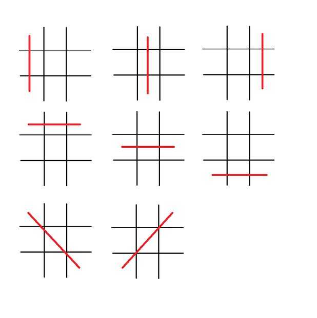 El primer proceso comprueba todos 8 victorias posibles (horizontal 3 vertical 3 y diagonal 2) para cada jugador para un total de 16 en caso de declaraciones.