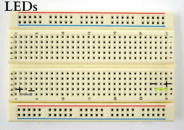 Una vez que se han añadido todos los resistores, vamos a colocar los LEDs en sus lugares apropiados. Las líneas grises corresponden al emisor de IR (el diodo azulado) y las líneas verdes de luz corresponden al detector IR (el LED claro). Es importante tener en cuenta que LEDs están polarizados, lo que significa que tienen un positivo y un extremo negativo. El extremo más largo del LED es el extremo positivo, así que les Oriente como se indica por el negro ventajas (+) y desventajas (-) en el diagrama.