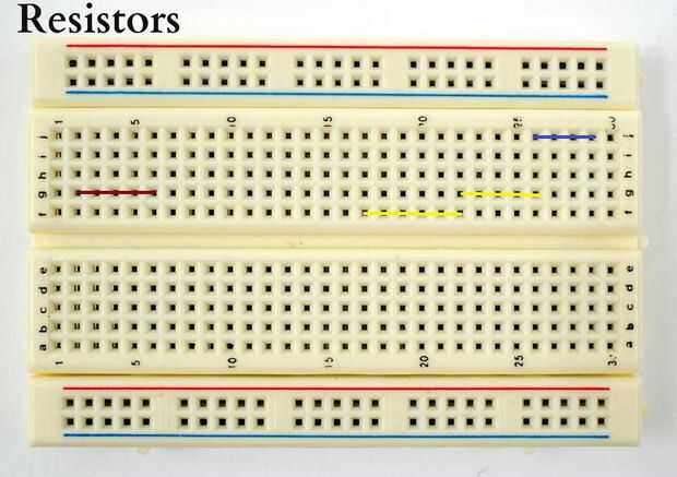 Ahora, vamos a conectar las resistencias como se muestra en el diagrama de cableado de la resistencia. Los colores corresponden a las siguientes resistencias: