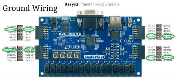 Primero, vamos a cable la placa Basys 3. Se puede lograr conectando un cable de puente desde una de las columnas verticales exteriores de la placa (marcado en naranja) a cualquiera de los pines de alimentación en los 3 Basys (marcados en rojo). A continuación, tenemos que conectar otro cable de puente desde uno de los pines de tierra en el Basys (marcada en verde) a una de las otras columnas vertical exteriores en la protoboard (marcada en negro).
