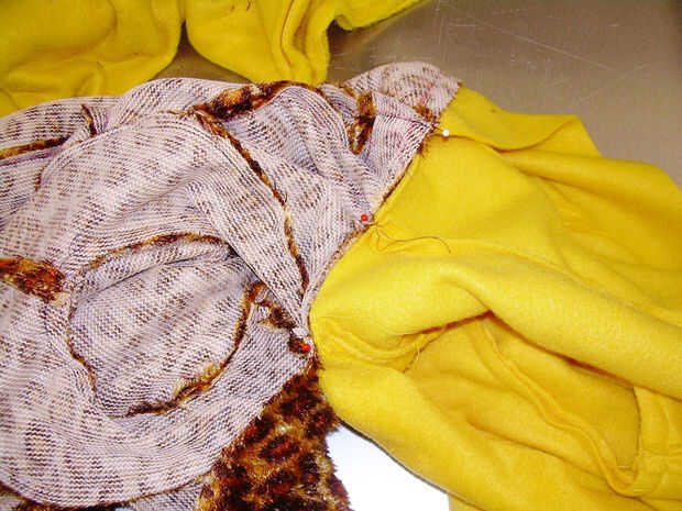 Comenzar fijando en el cuello espaldo y trabajar su manera alrededor. Prender cada 6 pulgadas o menos. Al llegar abajo de los lados, sostienen las dos piezas cada cierto tiempo para asegurar que están colgando correctamente - conseguir sus manos en las costuras de los hombros por lo que está colgando desde el mismo punto. Se trata de un tipo de molesto con las mangas todo incluidas por dentro, así que tenga cuidado.