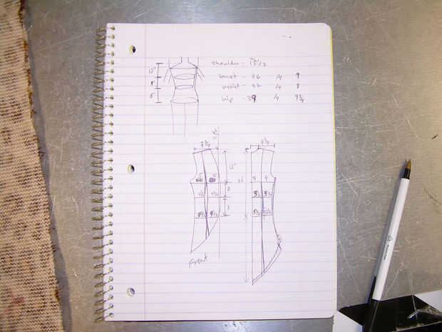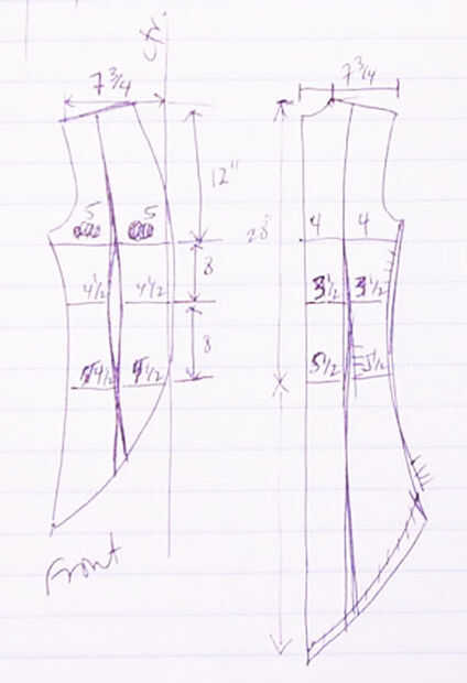 Ahora dibujar formas como en el dibujo a continuación, ver las notas de los detalles importantes. Te quiero pasar un poco de anchura de pieza a pieza para que coincida con su forma, pero recuerde mantener los valores totales de la misma. Por ejemplo, las medidas de cadera generalmente en su mayoría son a posteriori, por lo que a las piezas de la espalda sea un poco mayor en la cadera que las piezas delanteras, dejar que la prenda cuelgue correctamente.