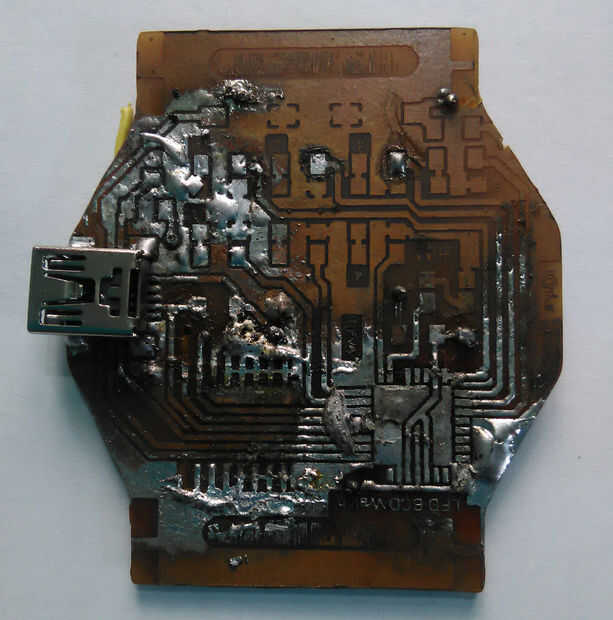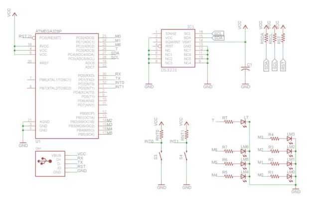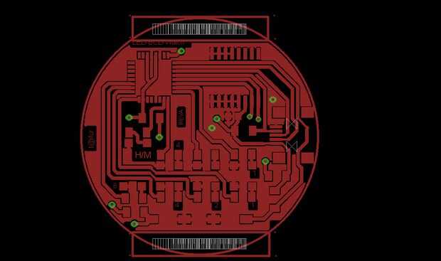 Este fue mi segundo intento de hacer el reloj. Como enfrenté problemas con gran número de LEDs para disminución de LEDs total a ocho, 7 minutos, horas y otro para determinar si 7 LEDs que indica minutos u horas (no es posible la visualización de horas y minutos al mismo tiempo utilizando 7 leds). Como un controlador usé ATmega8A por su bajo costo. DS3231 se utilizó como guardián del tiempo. Si observas el diagrama del circuito cuidadosamente usted verá que no utilizo cualquier oscilador externo. Quise utilizar el oscilador RC interno de 8MHz de ATmega8A chip. No había nada malo en el diagrama del circuito. Tablero del PWB fue diseñado considerando proyecto de bricolaje. Tamaño de rastros fue 24mil y un polígono de tierra fue utilizado para grabado mínimo. No usé máscara de la soldadura porque era un PCB casero y enmascarar materiales no estaba disponible para mí. Un conector USB mini fue unido al PCB para la carga y quema de propósito. El PCB completo era suficiente pero me enfrenté a dos problemas.
