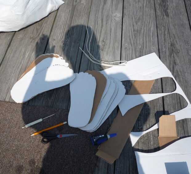 Sacar la forma del pie en la cartulina. Usted puede utilizar su propio pie u otro (menos respetuoso del medio ambiente) plástico flip flop. Corte esta primera forma y utilizar a la plantilla 12 formas, 6 izquierda y derecha 6. Voltee la forma para obtener el otro pie. Con el cúter y tijeras, corte las restantes formas 11.