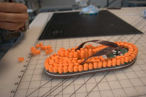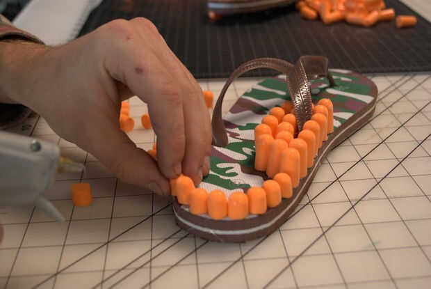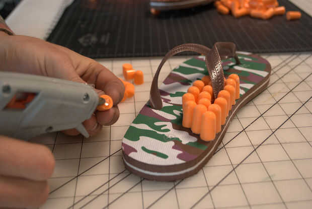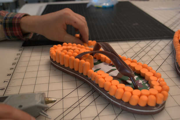 materiales:1: pato cinta (de cualquier tipo)2: tijeras3: un cuchillo4: cartón5:Sharpie o pluma6: piesPaso 1: Recoger materialesPaso 2: 1 º cortar el cartón en tirasEntonces trazar un contorno de los piesy cortarPaso 3: Tapa con cinta patoPaso 4: Cons
