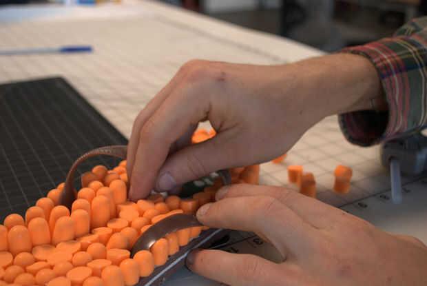 He tratado de mantener un patrón concéntrico bastante consistente al pegar en los tapones para los oídos. La capa exterior es todas las copas redondeadas de los tapones para los oídos y luego hay una capa de fondo. El patrón cayó aparte un poco hacia el interior, pero que está bien.