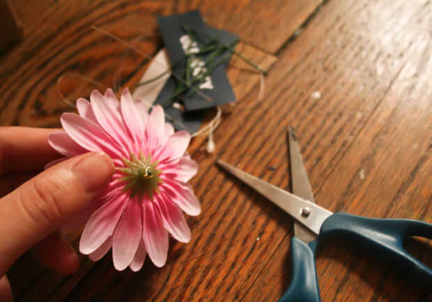 En primer lugar, cortar los tallos de sus flores y las etiquetas de sus ojotas. Usted puede hacer antes de tiempo mientras que la pistola de pegamento caliente se está calentando.