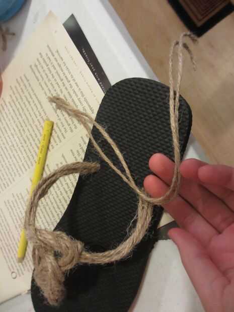 Tome cuatro cabos de la cuerda alrededor de 6 pulgadas de largo y pegar con pegamento a la cinta que ya hiciste, dos hebras por flip flop, como se muestra en la imagen.