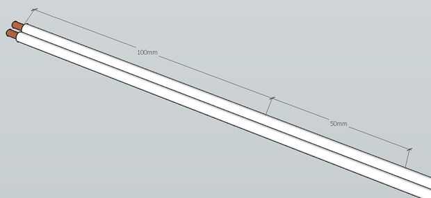 Tome el cable de 8 awg y cortar un trozo de 45cm de él y tira de los extremos unos 5 mm del material de aislamiento. Luego marque el alambre en 10cm y 15cm de un extremo. Cortar uno de los dos cables en medio de estas dos marcas y el alambre de 5 mm del material de aislamiento.