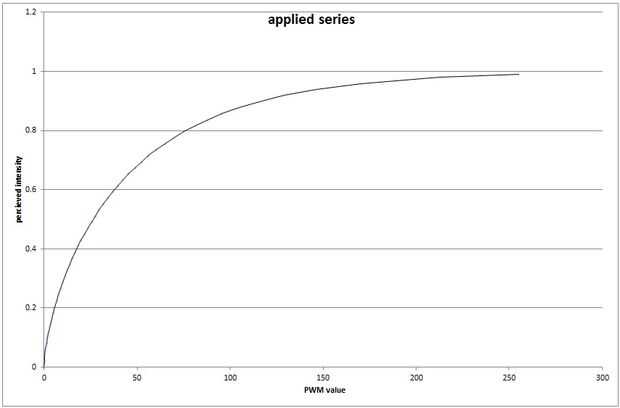 Porque estoy usando reguladores micro PICAXE el código está escrito en la variante básica utilizada por el Editor de programación de PICAXE. Esto presentó un problema porque esta variante básica no admite la fórmula para el cálculo de la intensidad de la luz. ¿Por qué es una fórmula necesaria para algo como eso? La percepción humana así de cualquier datos sensoriales es exponencial y esto incluye la intensidad de la luz. Así, para crear una luz que se descoloraría en forma lineal un código tuvo que ser escrito que permitiría tal una relación exponencial entre el brillo deseado y el valor PWM a ser posible. La tercera imagen muestra la relación entre el brillo deseado y el valor PWM. La relación primero fue calculada y ajustada en Excel, sin embargo debido al código de limitaciones antes mencionaron que he creado tres tablas de referencia muy grandes, uno para cada color, en lugar de otro copiando manualmente los valores de Excel.