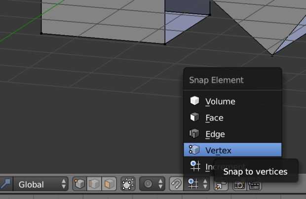 4. con ajuste de vértice: haga clic en el icono pequeño imán para ajustar, y siguiente para seleccionar vértice. Ahora haga clic en un vértice, tipo 'g' para grab. Ahora cuando se arrastra el ratón se moverá el vértice. Con ajuste de vértice activo, el vértice a 'saltar' partido exactamente la posición del otro vértice. Haga clic para aceptar la nueva ubicación del vértice.