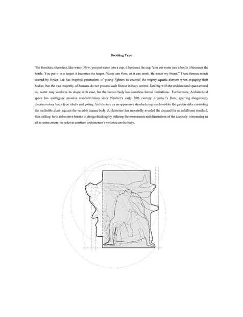 Un artista marcial bastante conocido una vez dijo, "sin forma, sin forma, como el agua. Ahora, ponga agua en una taza, se convierte en la taza. Pones agua en una botella se convierte en la botella. Lo pones en una tetera se convierte en la tetera. El agua puede fluir o puede chocar. Ser agua mi amigo". Estas famosas palabras pronunciadas por nada menos que Bruce Lee ha inspirado a generaciones de jóvenes combatientes para canalizar el elemento poderoso acuático cuando sus cuerpos, pero la gran mayoría de los seres humanos no poseen tal finura en el control del cuerpo. Tratando con el espacio arquitectónico que nos rodea, agua puede ajustarse su forma con facilidad, pero el cuerpo humano tiene innumerables limitaciones formales. Desde principios del siglo XX, espacio arquitectónico ha sufrido gran estandarización con datos arquitecto de Neufert, lo ideales de tipo cuerpo peligrosamente discriminatorias y picaduras arquitectura como una opresiva normalización máquina - como la estaca del jardín contorsionar la planta maleable - contra el cuerpo humano variable. Arquitectura ha evitado repetidamente la demanda por un estándar indiferente, así llamando subversivo se rompe en el pensamiento de diseño mediante la utilización de los movimientos y dimensiones de la anomalía, que nos preocupa a alguno grado - para enfrentar la violencia de la arquitectura en el cuerpo.