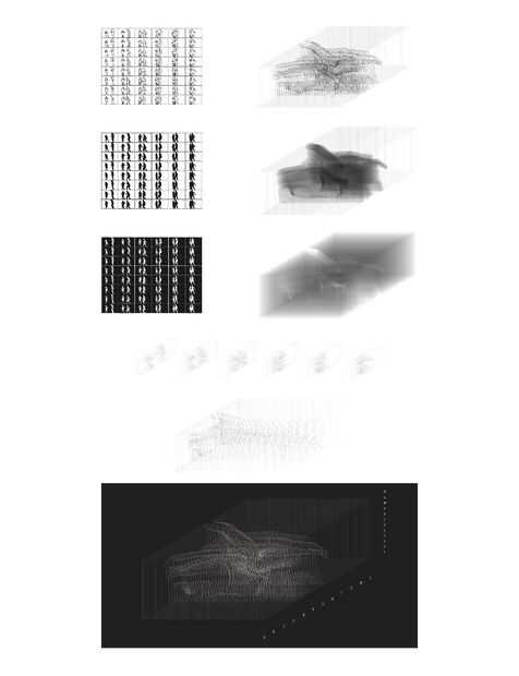 Con los movimientos de cuerpo trazados dentro de un marco fijo, a lo largo de un periodo de tiempo me quedé con los marcos extendidos hacia fuera de los movimientos vectorizados. En lugar de ver otra vez a través del tiempo como lo hicimos anteriormente en el vídeo, decidí darles características espaciales de representación a través de un material sólido.
