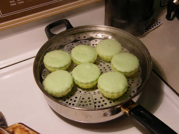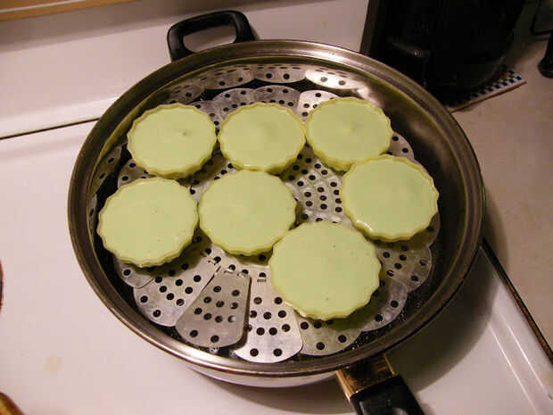 Cuchara alrededor de 1 cucharadita humedecido coco desecado en los moldes engrasados, usando el dedo o la cuchara, presionar y ajustar el coco desecado a los moldes; Vierta aproximadamente 3 cucharadas pasta, cocer al vapor durante 15 minutos.