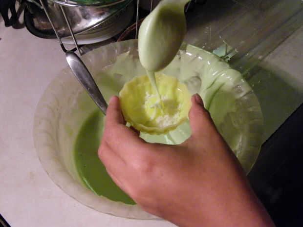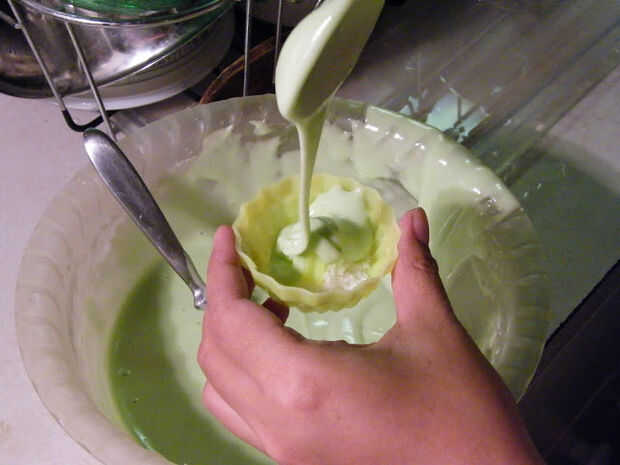 una gota o dos pandano verde (hoja del pino del tornillo) esencia y pegar (se pueden utilizar pasta de chocolate, pasta de leche, esencia de pistacho o cualquier saborizante te gusta realmente!)