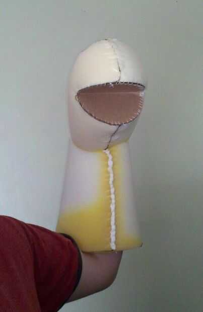 Ahora que todo es seco... pegar y coser la cabeza y cuerpo juntos y dejar secar. Tu títere es realmente empezando a ver ahora como algo...