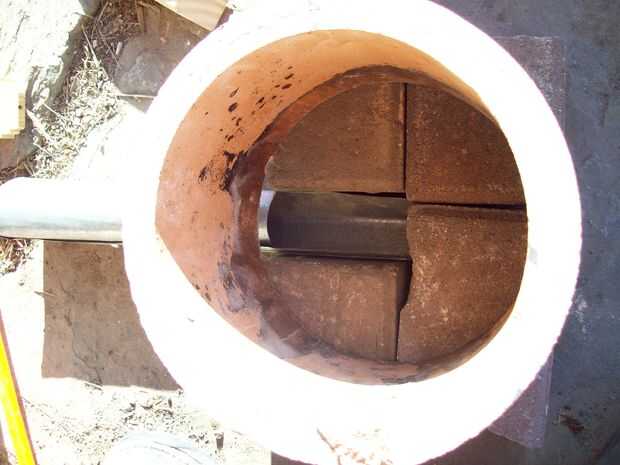 Tome la chapa y la curva alrededor de un tubo o algo redondo hasta que tenga un 18" largo tubo cerca 2" de diámetro. debe caber en el hueco de los ladrillos para que el final es en el centro del tubo de la chimenea encima de los ladrillos. Utilice tornillos para anclaje para que la tubería mantiene su forma. Corte a la mitad de la tubería dentro de la fragua para que aire puede entrar. Dry fit todo para asegurarse de que funciona.