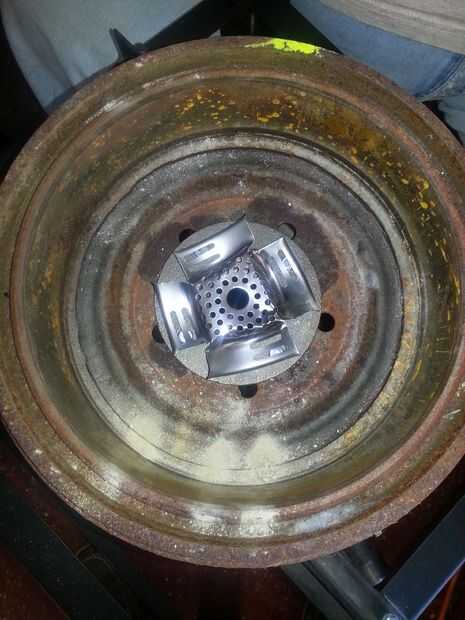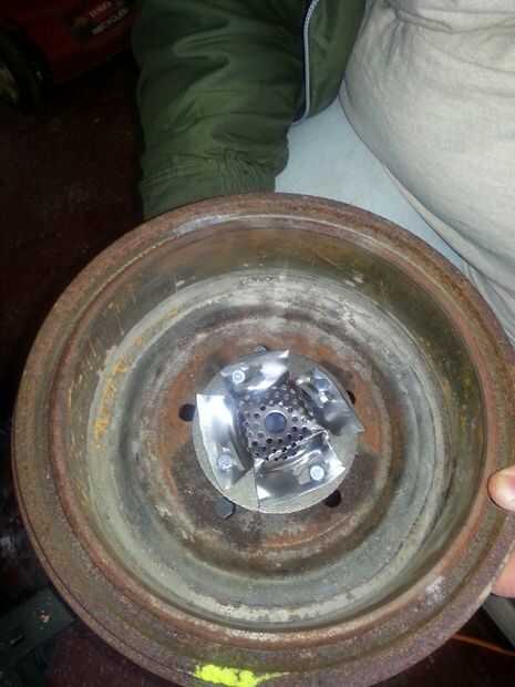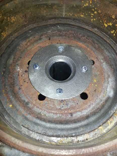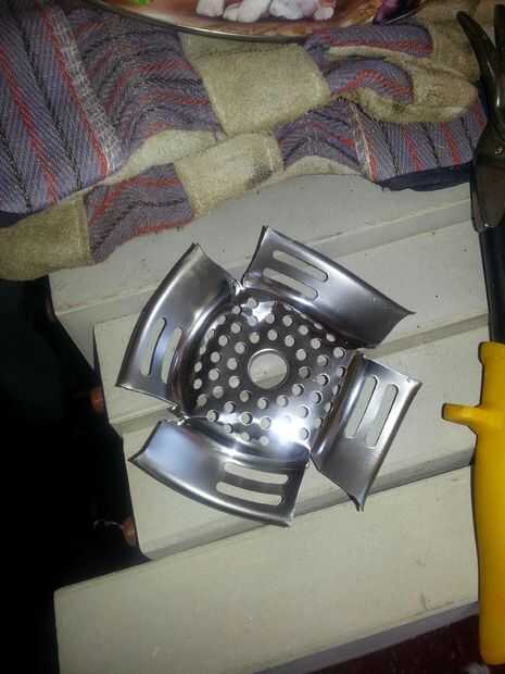 A continuación cortamos la pantalla fregadero para caber sobre el agujero. He quitado la pieza de plástico del centro y utiliza los esquileos de metal para hacer cuatro cortes. Había aplanado hacia fuera y atornilla con la brida del piso. Nosotros sólo habían ampliado los orificios que se encuentran en el filtro. Utilizamos cuatro pernos de acero inoxidable para mantener todo en su lugar. El orden de las piezas es el siguiente: freno de tambor en la parte inferior, la brida para piso (hilos apuntando hacia abajo) en el orificio del tambor de freno y la pantalla del fregadero en la parte superior del reborde.