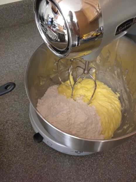 Añadir 1 taza de harina a la mezcla. Usted puede hacer esto de una vez, o un poco a la vez. Asegúrese de que está incorporada toda la harina y la mezcla se mezcla bien.