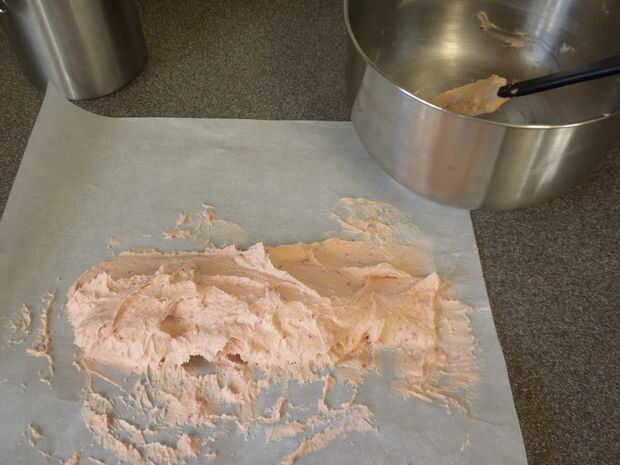 Una vez que la masa se mezcla bien, quite la masa y cuchara o extendido en el papel de pergamino.