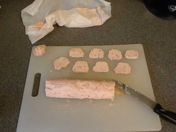 Luego con un cuchillo cortar galletas en aproximadamente la mitad de una pulgada o usted puede hacer un poco más gruesa si te gusta.