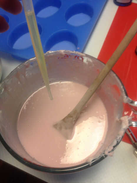 Añadí el aceite de la fragancia del limón al jabón de color verde y aceite de la fragancia de frambuesa para el jabón color rosa.