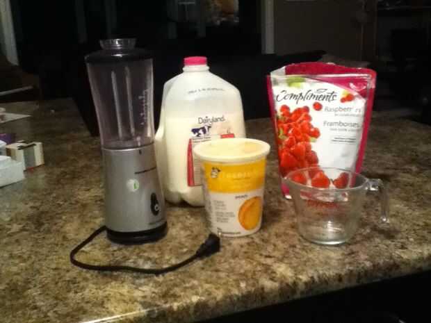 Necesita: de la frambuesa congelada, yogur melocotón, leche, taza, licuadora.