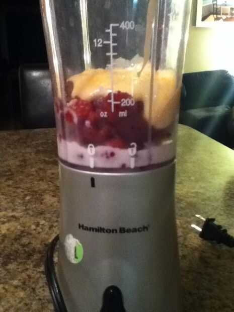 Agregar 1/3 de taza de yogur de melocotón en la licuadora.
