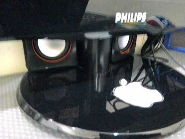Cada equipo debe tener una fuente de audio y mi monitor no tiene ninguna así que compré un par barato de altavoces USB! La pegatina de apple es solo para el deco, lo obtuve de mi amigo que compró un ipod.