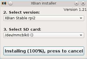 - Haga clic en instalar. Confirmar que está bien para borrar la tarjeta microSD. El instalador le pedirá descargar Xbian. Aprobar y luego esperar a que el proceso de acabado.