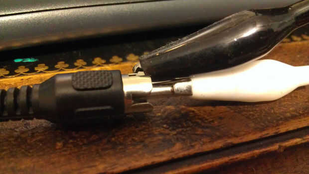 En la segunda foto, puedes ver el clip de cocodrilo blanco conectado al pin de señal de un conector RCA y la pinza conectada a la parte de puesta a tierra del conector RCA. El otro extremo del cable RCA esto entró poco portable tv CRT que tengo que también puede aceptar entrada de vídeo compuesto.